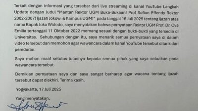 Jakarta – Mantan Rektor Universitas Gadjah Mada (UGM) Profesor Sofian Effendi menyampaikan permohonan maaf seusai…